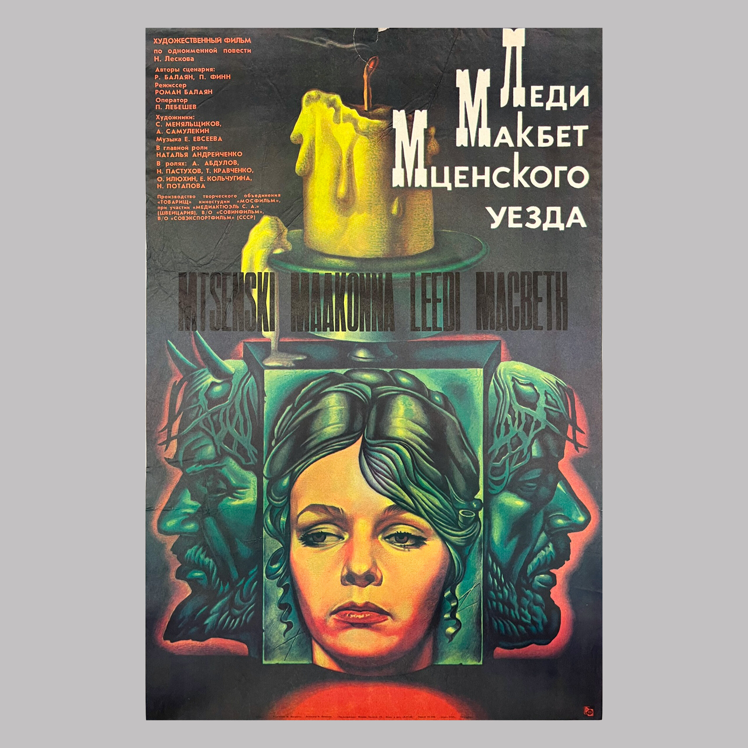 This is an Estonian release poster for the Soviet film Mtsenski maakonna leedi Macbeth, the local title of Леди Макбет Мценского уезда. The film was released in 1989, directed by Roman Balayan and based on Nikolai Leskov’s 1864 novella of the same name. It belongs to the late Soviet wave of literary screen adaptations, bringing a classic work of Russian literature into cinema at the end of the Soviet period.