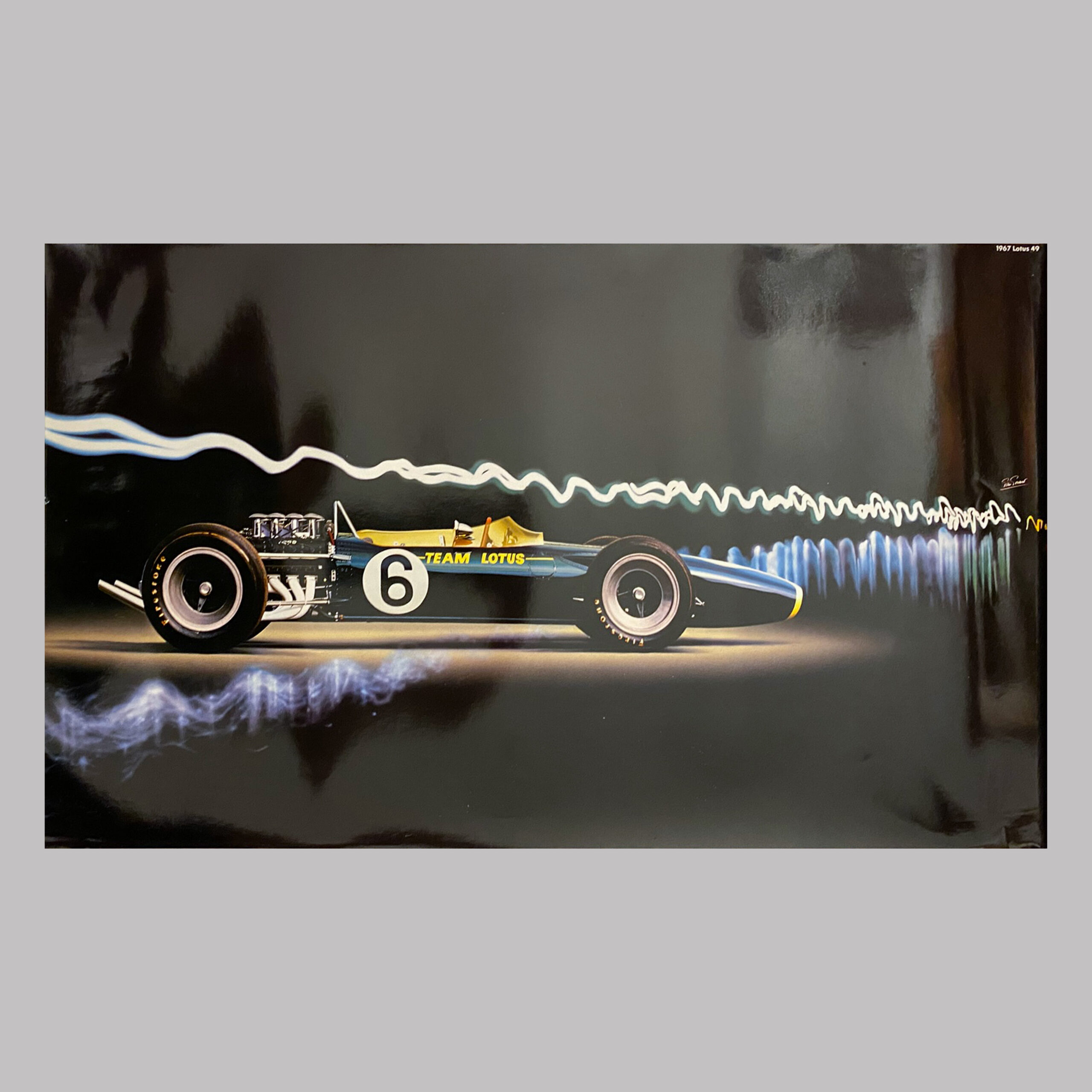 This poster is a stylized tribute to the 1967 Lotus 49, one of the most important Formula 1 cars ever built. Introduced by Team Lotus in 1967, the 49 was the first F1 car designed around the Cosworth DFV engine used as a stressed structural member, a breakthrough layout that reshaped race-car engineering for decades.