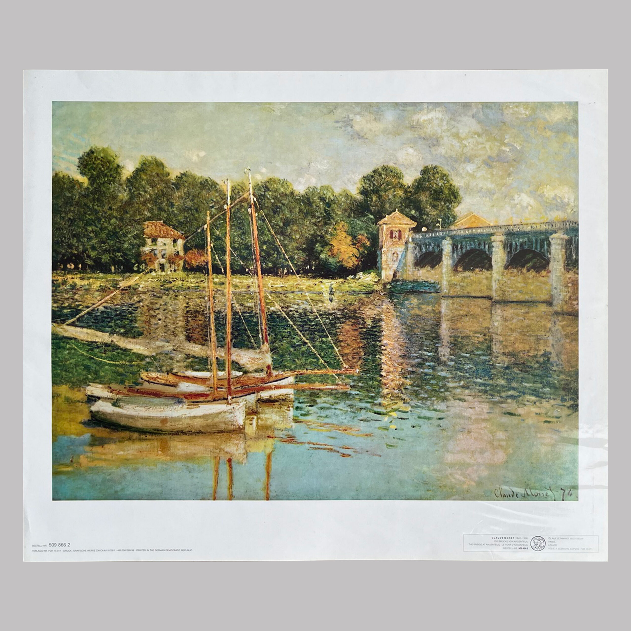 This poster features Monet’s 1874 painting Die Brücke von Argenteuil (The Bridge at Argenteuil), originally produced by the Impressionist artist. The poster version presents Monet’s landscape of the Seine river with its iconic Argenteuil bridge as a fine-art print for wall display